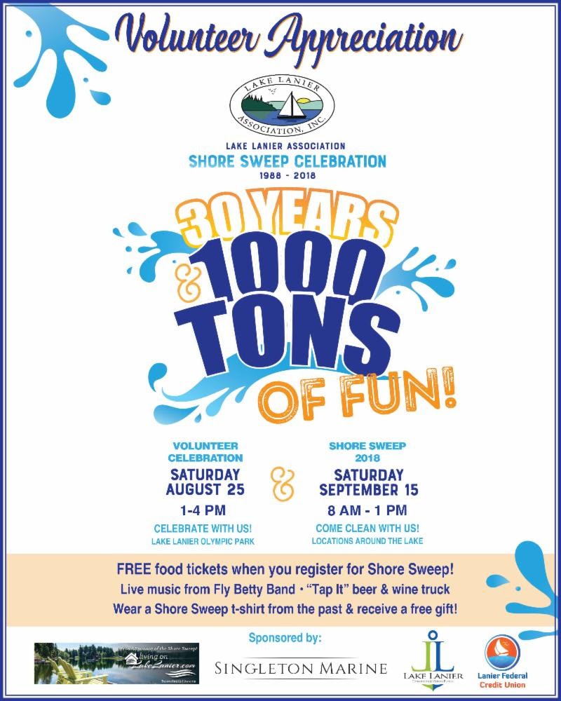 It’s hard to believe the brainchild of the Lake Lanier Association is getting so old. Come celebrate Shore Sweep’s 30th birthday with a party on August 25, 2018, at Lake Lanier Olympic Park.